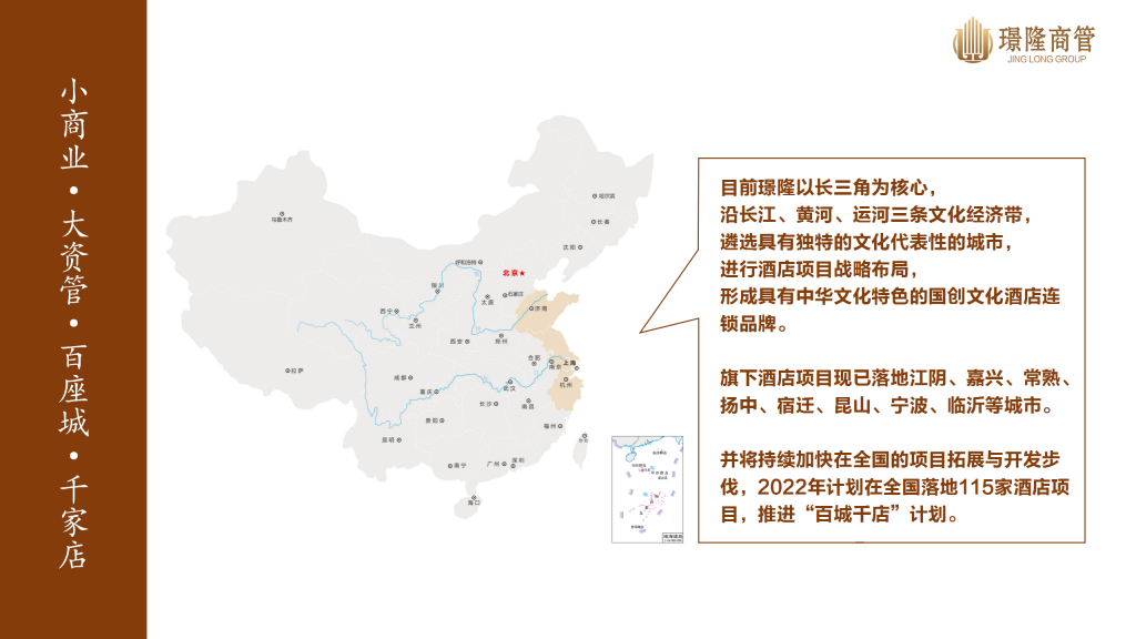 在注重以長三角為核心的一二線城市的項(xiàng)目布局同時(shí),亦更加注重沿長江、黃河、運(yùn)河遴選具有文化代表性城市的下沉市場進(jìn)行戰(zhàn)略布局,旗下酒店項(xiàng)目現(xiàn)已落地上海、江陰、嘉興、常熟、揚(yáng)中、宿遷、昆山、寧波、臨沂等城市。并將持續(xù)加快在全國的項(xiàng)目拓展與開發(fā)步伐,全面推進(jìn)“百城千店”計(jì)劃。