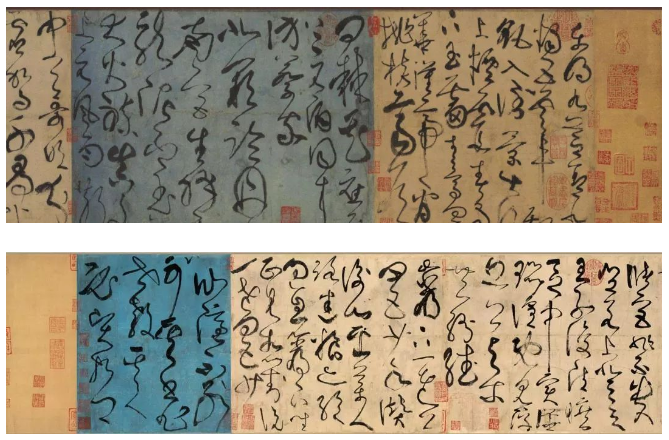 張旭因?yàn)橄矚g在墻上潑墨,所以其留在紙上傳世于今的書法少之又少。而其草書孤品《古詩四貼》便是其傳于今世的驚天墨寶,使用當(dāng)時(shí)珍貴的五色箋書就,共40行,凡188字,縱29.5厘米、橫195.2厘米,現(xiàn)已成為遼寧博物館鎮(zhèn)館之寶。是故,便有了我們本文開頭時(shí)的視頻,遼寧電視臺制作的節(jié)目——《對話大唐:長安城內(nèi)無粉壁,這事賴張旭》。